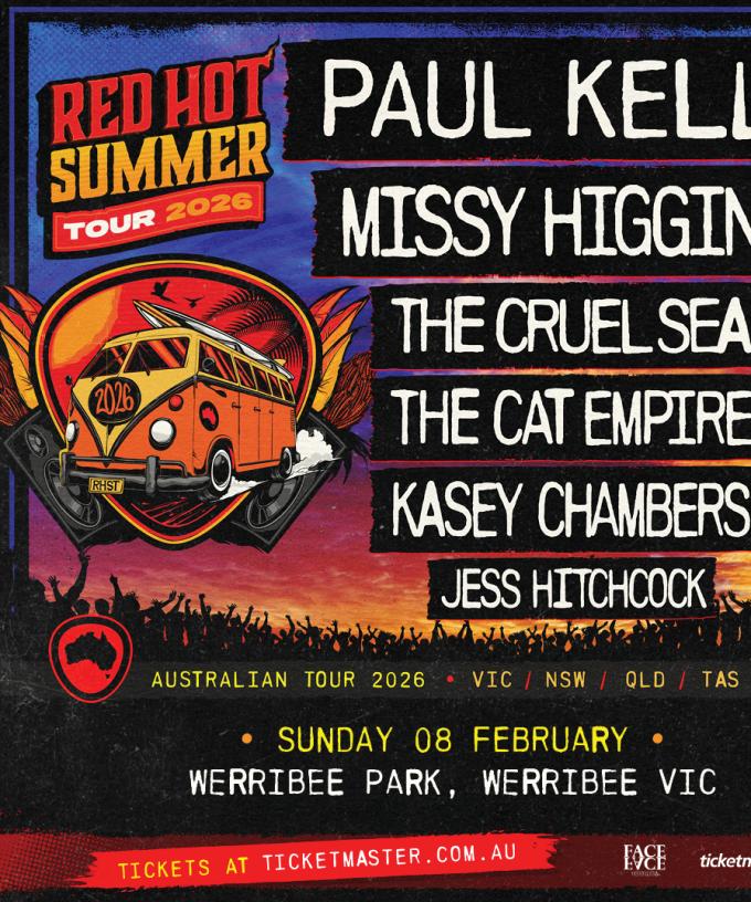 Red Hot Summer Tour is heating up in 2026, headlined by Paul Kelly and with a spectacular line-up featuring Missy Higgins, The Cruel Sea, The Cat Empire, Kasey Chambers, and Jess Hitchcock.